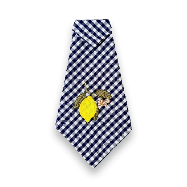 Guardanapo em algodão xadrez azul marinho e branco com bordado limao siciliano