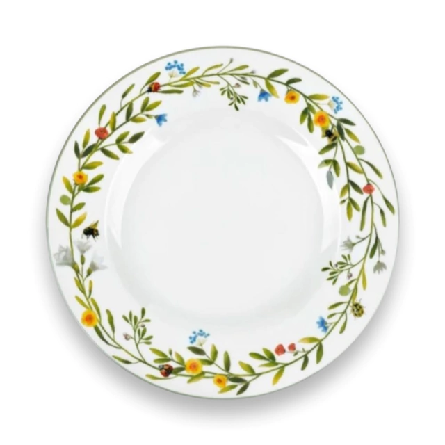 Garanta o Prato Raso Floracom decalque de folhagens no contorno e filete verde. Perfeito para adicionar elegância e estilo à sua mesa. Compre agora e transforme suas refeições!